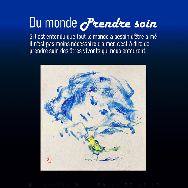 Acrylique sur toile de lin sur châssis format 40x40 cm. Œuvre unique peinte par Marc HANNIET. Cette toile fait partie d'une petite série qui témoigne que prendre soin du monde et en particulier du vivant qui nous entoure serait peut-être une bonne idée. Ici on peut imaginer que le visage humain regarde l'oiseau depuis chez lui, une vitre les sépare mais pourtant ils respirent le même air.